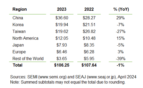 Worldwide sales of semiconductor manufacturing equipment edged down 1.3% to $106.3 billion in 2023 from an all-time record of $107.6 billion in 2022.