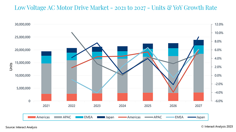 Jan. 23, 2023 - Strong unit sales in the APAC region increased growth in the low voltage AC drive market during 2022 to an estimated $14.2bn, according to a new report. This growth is heavily driven by retrofit opportunity and increased energy efficiency legislation throughout the region. Research from Interact Analysis reveals that order backlogs resulting from the COVID-19 pandemic fueled the sector over the year, while most drive manufacturers also reported price increases in 2022. However, order intake did not lead to a rise in unit sales in all cases, as supply chain problems affected the ability of some vendors to fulfill orders.