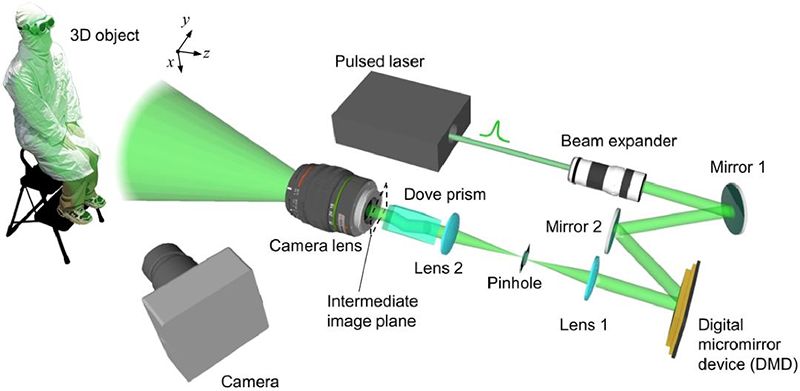 The MS-BLIP system begins with a pulsed laser used as the light source. After expansion and collimation, the beam is directed to a 0.45” DMD (Digital Micromirror Device) at an incident angle of ∼24° to its surface normal. Binary fringe masks, generated by an error diffusion algorithm from their corresponding grayscale patterns, are loaded onto the DMD and displayed at up to 1 kHz. A band-limited 4f imaging system that consists of two lenses and one pinhole converts these binary patterns to grayscale fringes at the intermediate image plane. The smallest period in the used sinusoidal fringe patterns is 388.8 µm, which demands a 150-µm-diameter pinhole to pass the spatial frequency components of these patterns while filtering all noise induced by the digital half-toning. A dove prism rotates the generated fringe patterns to match the aspect ratio of the targeted scene. Then, a camera lens (AF-P DX NIKKOR 10-20mm f/4.5-5.6G VR, Nikon) projects these fringe patterns onto 3D objects. The deformed structure images are captured by an Optronis CP70-1HS-M-1900 CoaXPress camera with an Azure lens. Synchronized by the DMD’s trigger signal, the acquired images are transferred to a computer via a cable to a BitFlow Cyton-CXP CoaXPress frame grabber built on a half-size x8 PCI Gen 3.0 express board compliant with the CXP 1.1 standard.