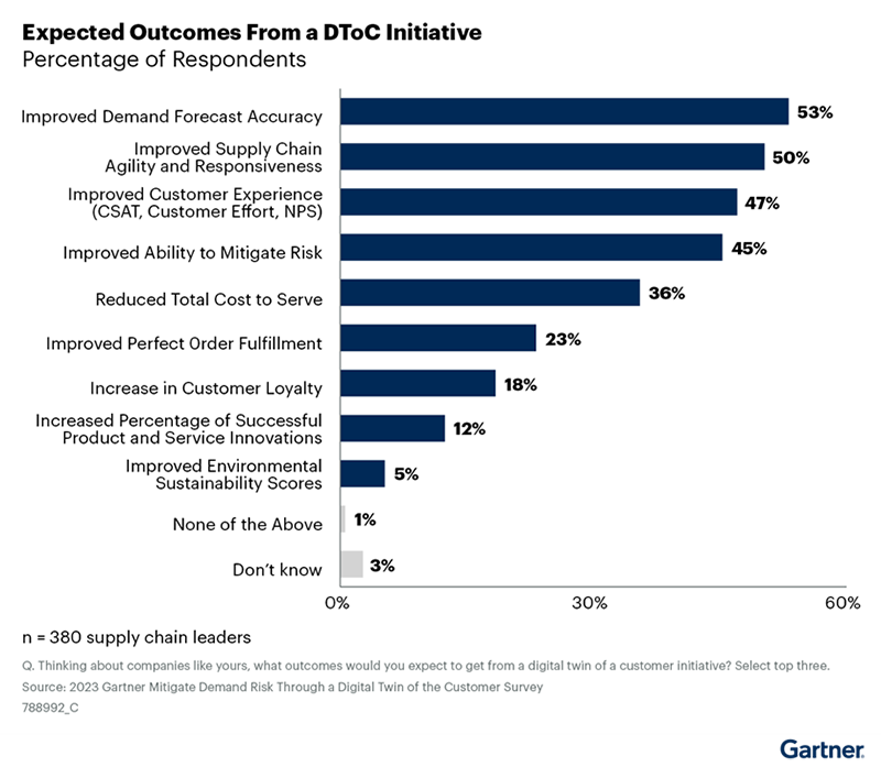 Gartner surveyed 380 supply chain leaders in January 2023 and found that while 60% are piloting or plan to implement a digital supply chain twin (DSCT), just 27% were also planning to incorporate a DToC as part of their digital strategy.