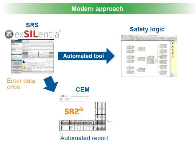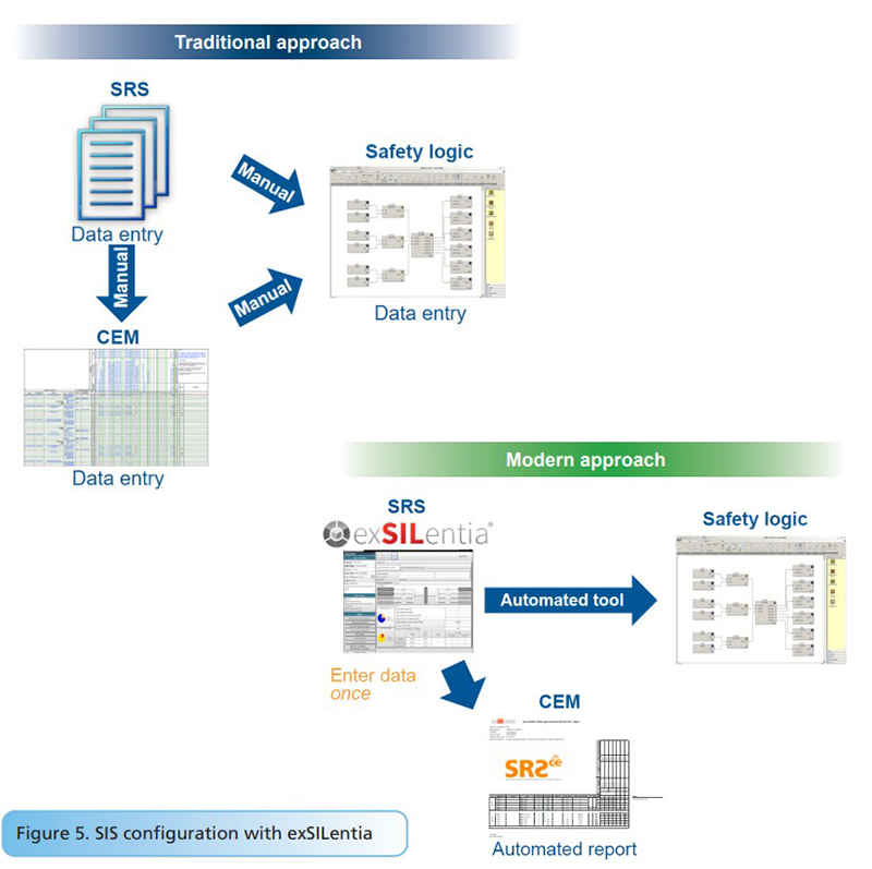 In a traditional SIS configuration approach, the project team uses the SRS, along with a custom-built CEM as the basis for the safety logic configuration. The SRS and CEM are manually interpreted and translated into the safety logic. This configuration model requires multiple data entry stages and presents opportunities for human error. The new configuration approach powered by exSILentia leverages data structures created during the conceptual design to automatically generate safety logic (Figure 5).