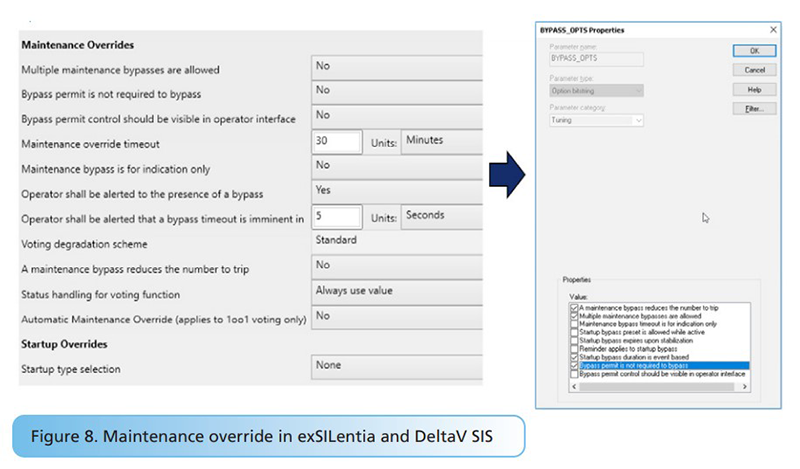 There also are parallel structures for maintenance overrides. The maintenance override requirements in exSILentia are mapped to the DeltaV SIS bypass option parameter (Figure 8).