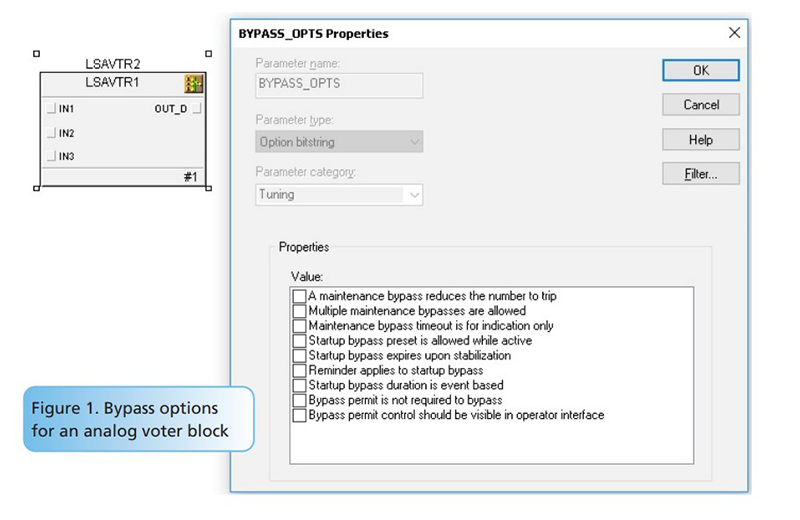 One of the advanced function blocks is the analog voter function block, which has advanced features to easily implement “M” out of “N” voter functions. That is, “M” inputs of the total “N” inputs must vote to trip. For example, the block can be configured as a 2oo3 (two out of three) voter, where two of the three inputs must exceed the trip limit before the output is tripped. What used to take a fair amount of programming using “AND” and “OR” logical gates is now replaced by a standard function block configured using radio buttons and check boxes (Figure 1). For example, if the application needs to prevent multiple maintenance bypasses at the same time, the user only needs to check one box. If the application requires a bypass timeout to either automatically remove the bypass after a predefined time or simplify to provide an alert, the user again just needs to select the proper options within the bypass option parameter.