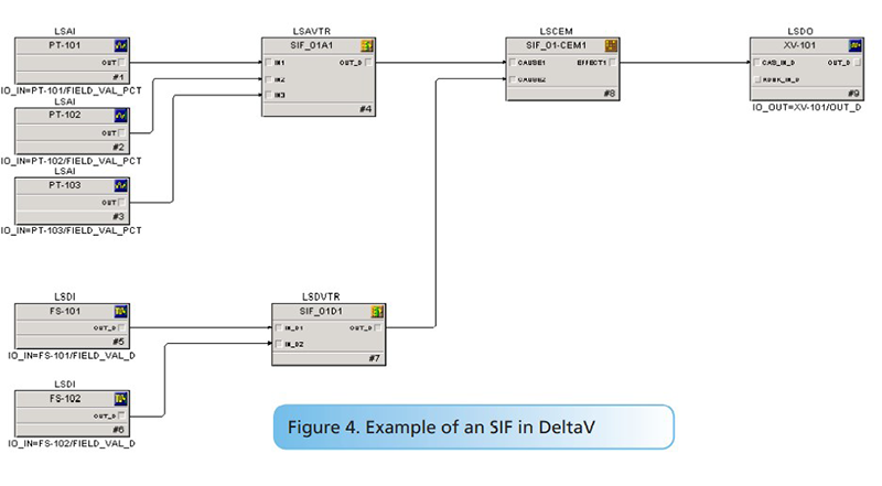 SIF configuration Implementing a SIF in DeltaV SIS is quite simple (Figure 4): 1. Drag and drop the proper function blocks. 2. Wire the function blocks as appropriate. 3. Configure the proper parameters.
