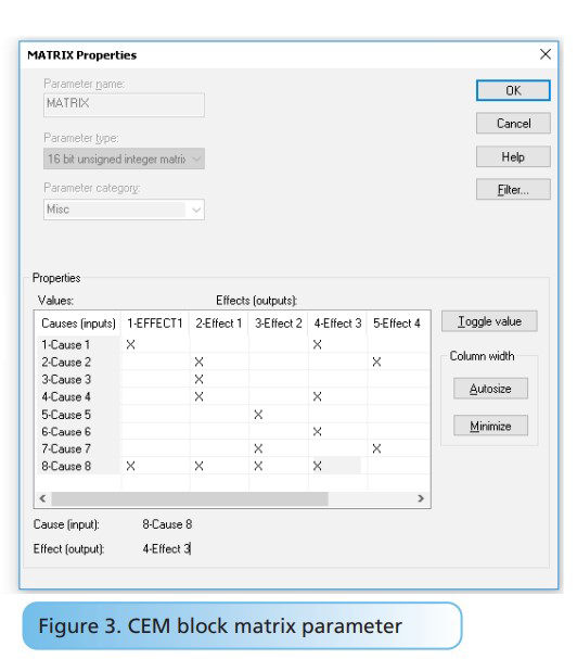 Implementing a cause-and-effect relationship is done using another advanced function block. The cause-and-effect metrix function block defines interlock and permissive logic that associates as many as 16 inputs (causes) and 16 outputs (effects). The block’s “MATRIX” parameter defines the causes that produce each effect to trip. Figure 3 provides an example of how to configure an 8×3 CEM. Defining the trip logic is as simple as selecting the proper intersections in the “MATRIX” parameter.