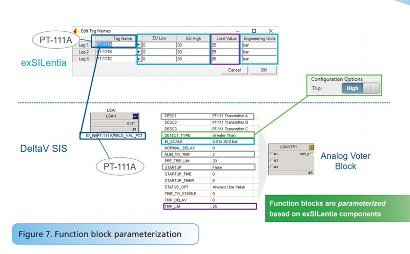 The exSILentia solution defines DeltaV SIS function blocks and the appropriate connections based on the SIL calculation diagram (in SILVer). exSILentia also parameterizes the DeltaV SIS function blocks based on the exSILentia data. Parameters such as I/O tag, trip limits, ranges, engineering units, and trip direction are defined as part of SIF definitions within exSILentia. All those exSILentia settings are properly mapped to parameters within the DeltaV SIS function block (Figure 7).