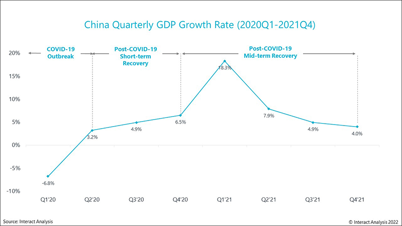 China’s GDP grew by 8.1% in 2021. This was largely due to the 18.3% COVID rebound in the first quarter (Q1). Meanwhile, the remainder of the year saw strong downward pressure, with growth coming in at 7.93% in Q2, and 4.9% and 4.0% in Q3 and Q4 respectively. This was due to a range of factors. While in Q1 government fiscal policy was focused on measures which enabled the economy to bounce back. For the rest of the year policy was directed more by medium and long-term considerations, and was slower in its implementation. Investment declined as a consequence.