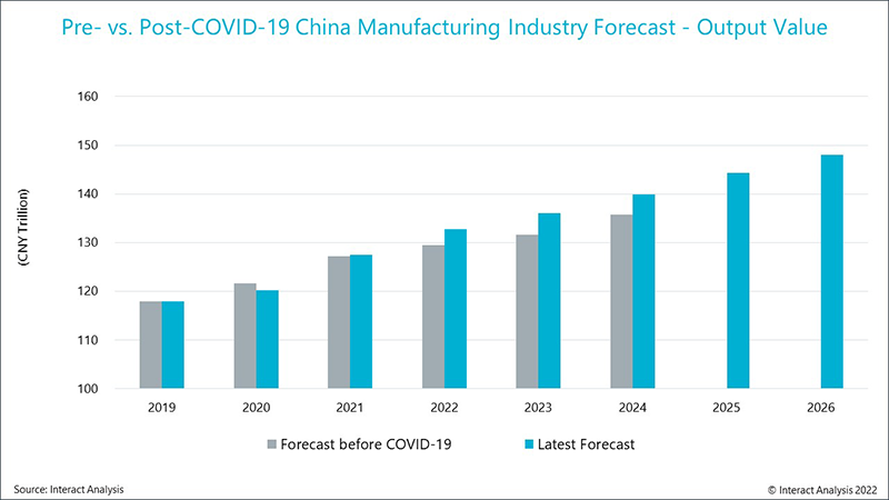 The chart above shows a comparison of our forecasting for Chinese manufacturing output made before and after the pandemic. Note how from 2021 to 2024, post-pandemic forecasts outstrip pre-pandemic ones. A measure of the resilience of the Chinese manufacturing economy. However, in spite of the strong initial recovery and steady growth the region is predicted to see up to 2026, competitors are catching up. The late rebound of the region’s competitors will mean that, at least for a period, the growth rate of China’s manufacturing industry will lag behind that of its competitors. This is something the world has not seen for a long time.