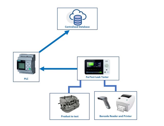 ForTest equipment also allows the use of multiple tracking systems at the same time. For example, you can use an external PLC as well as a label printer connected to a barcode reader. In the case described above, the leak tester will be connected to the part that has to be tested, which will be labelled with a sticker with a unique barcode that identifies it. In this case, the PLC will communicate via Profinet or EtherNet IP and will automize the testing, the data collection and the data saving process on a database.