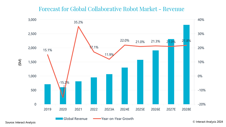 LONDON - May 29, 2024 - The global collaborative robot (cobot) market topped $1 billion in revenues during 2023, despite overall demand recovering more slowly than expected post pandemic, according to new data from Interact Analysis. Looking to the future, the market intelligence specialist predicts the global market for cobots will see a 22% increase in shipments during 2024 and anticipates similar levels of growth (>20%) each year through to 2028.