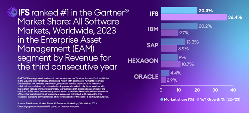 IFS is named #1 in the Gartner Market Share: All Software Markets, Worldwide, 2023 report, based on a market share of 20.3%, revenues of $452m and 36.4% year-over-year growth in 2022-2023.