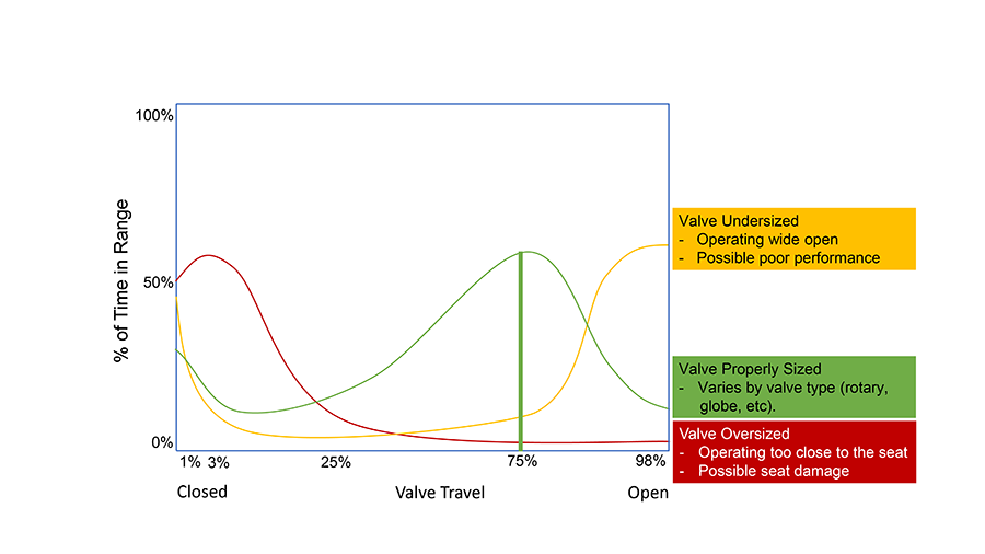 Other analytical techniques monitor the performance of the valve over time, noting where it usually operates (Figure 5). The algorithms utilize that information to identify poorly specified valves that are operating near the edge of their performance curves. This information can predict long-term equipment problems, such as potential seat damage on a grossly oversized valve that is operating near 0% opening. It can also highlight valves that are constraining overall production throughput and limiting plant capacity, along with other issues.