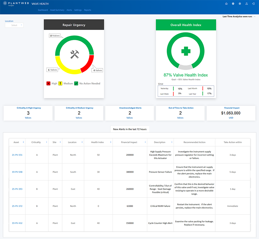Problematic valves are highlighted using colors, simplifying selection of developing issues, each of which can be further investigated by selecting a valve and drilling down for more detailed information on the valve condition. Individual alerts can be chosen to obtain specific information about the problem, as well as a set of corrective actions a technician can take to address and resolve the issue.