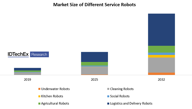 Including Tesla’s entry, IDTechEx believes that the service robot market will further expand. IDTechEx believes that the service robot market will surpass US$70 billion by 2032, representing a 4.7-fold increase compared with the current market (2022).