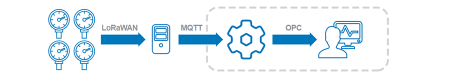 The Heritage team installed HiberHilo sensors throughout their offshore production facilities where monitoring was required, and sent the data stream from each sensor to a LoRaWAN network server. That server was connected to a DataHub instance as an MQTT client by the TATL team. They then used the DataHub MQTT Smart Broker to collect and integrate the MQTT data streams and send the results by OPC to AVEVA InTouch, Historian and Web Client, supplementing the rest of the process data.