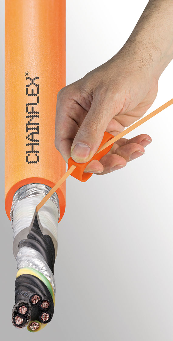 With an integrated “CFRIP” tear strip, the cable’s jacket is openable like a zip fastener. The CFRIP tool protects fingers from the taught CFRIP thread while stripping.