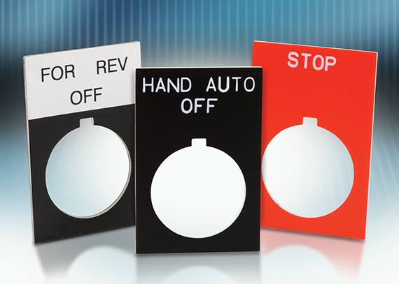 Plastic legend plates have white engraved text on a black or red background. Aluminum legend plates have a black or red field with silver background.