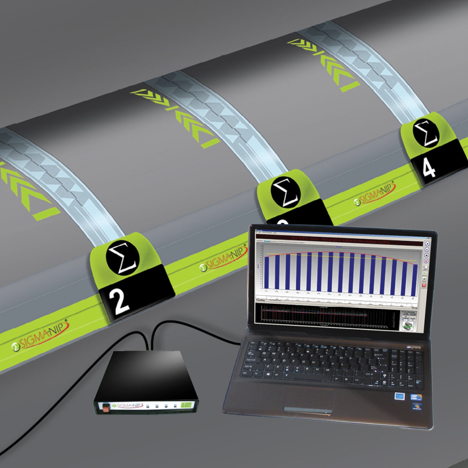 August 17, 2011 – Sensor Products announces Sigma-Nip version 2.2 of its nip roller analysis tool. Upon the application of force at the closing of the nip this portable sensor and software system reveals the precise level of pressure and where the pressure is occurring. This enables the user to instantaneously determine whether the rollers are aligned properly and are squeezing together sufficiently. Operators can then use the images and data of actual nip condition provided to more easily calculate the precise adjustment of roller pressure needed for uniformity and alignment. Sigma-Nip is being used by clients such as Metso Paper worldwide for routine maintenance as well as the set up of rollers. An evenly loaded roller set will extend blanket life as well as increase web control and throughput quality. Sigma-Nip version 2.2 operates in higher moisture, heat 0 – 300° F (-17.7 to 149° C) and pressure environments 40 – 10,000 PSI (2.8 – 703 kg/cm2) to make it potentially applicable to virtually all nip applications in the pulp & paper industry (including calendaring), as well as in the printing and converting industries. New electronic hardware has been introduced including new sensor and casing materials to enable the sensor carrier chain to endure repeated use in demanding environments and routine exposure to heat, grease, liquids and inks. The nip profiling system’s diagnostic software updates in real time as pressure adjustments to the rollers are made. The software is so intuitive and user friendly that within minutes even an inexperienced user can benefit from its reports Nip profiles can be viewed in several software formats that provide detailed information about nip condition. Sigma-Nip is available in two versions –standard Sigma-Nip and Mini Sigma-Nip, which is designed for rollers with smaller circumferences or larger hard roller sets which have small contact areas. The systems may be specified in face lengths 35” to 443” (90 cm to 1,125cm), nip widths 0.15 in. (0.38 cm) to 9 in. (22.9 cm). The same sensor chain can handle a wide variety of nip widths.